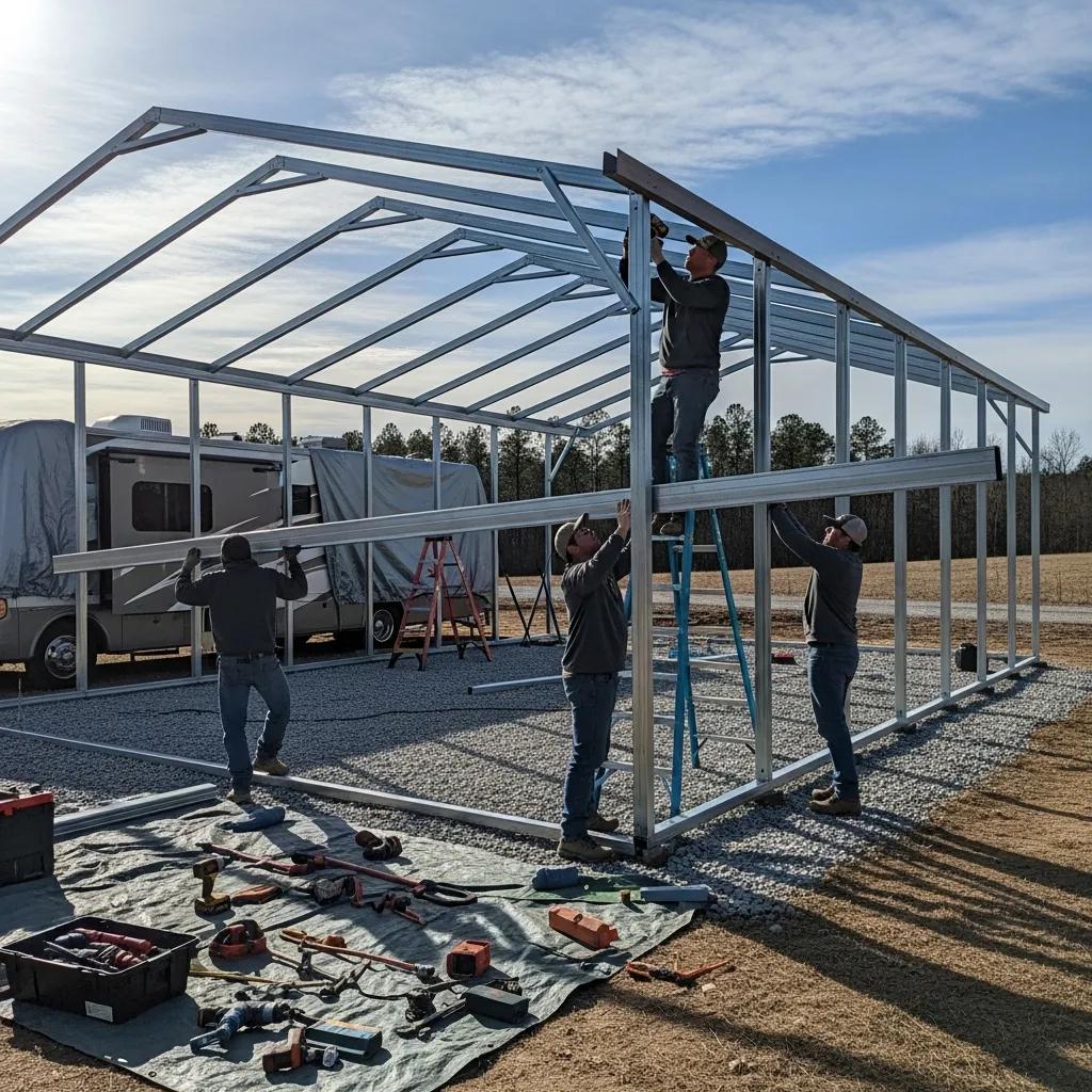 Our professional crew typically: clears and grades the area, checks soil and drainage, places concrete footings or anchor pads per local code, erects the frame and fastens it, then completes roofing and trim. Final checks ensure plumb, level, and secure connections, guaranteeing a sturdy and reliable structure for your motorhome.